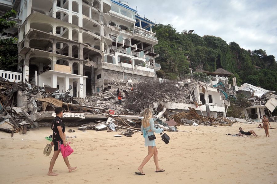 Wisatawan mancanegara sedang menyaksikan pembongkaran bangunan akomodasi wisata di Pantai Bingin (Sept.2025 - BaliPost)