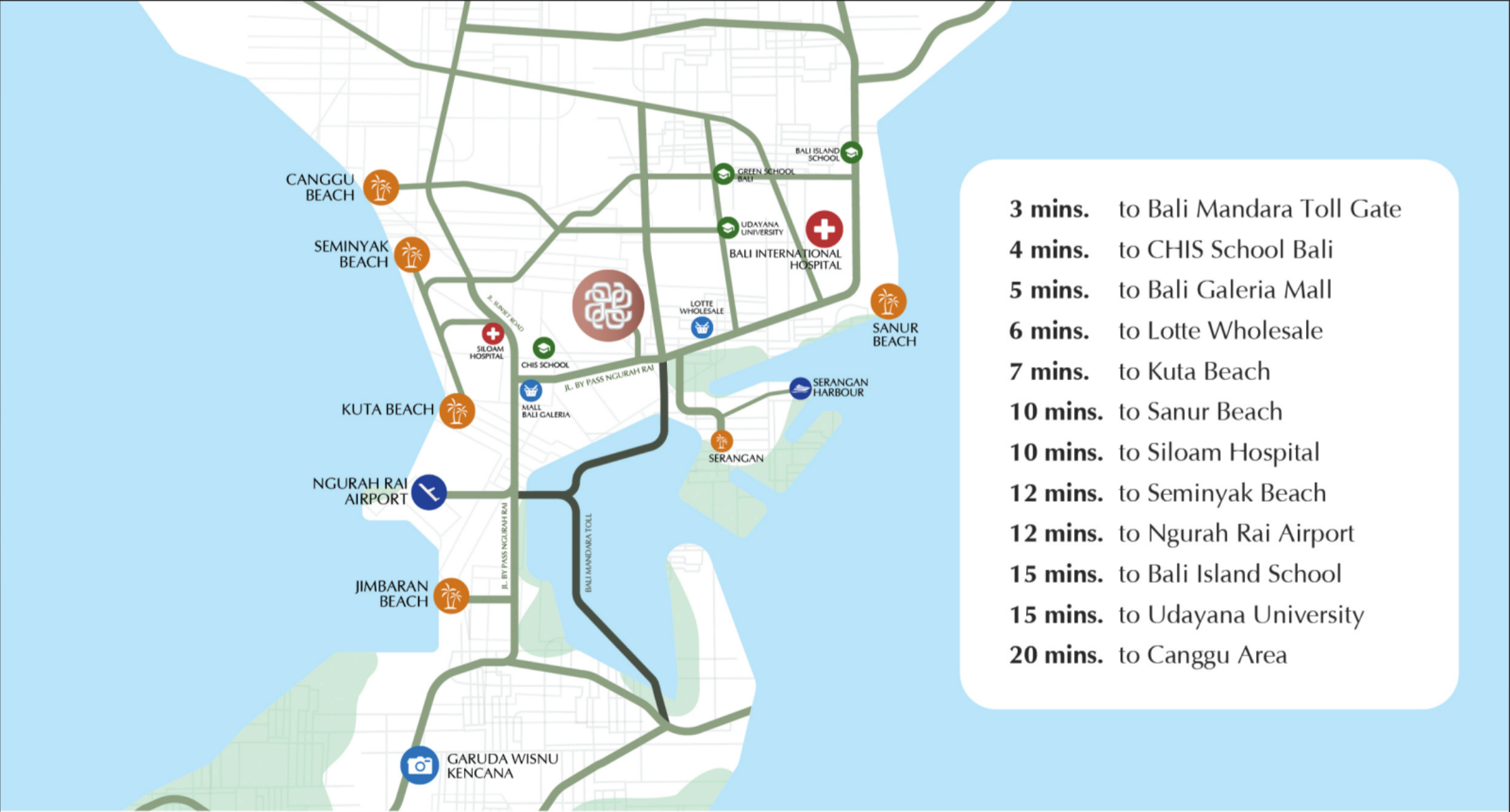 Terletak hanya beberapa menit dari akses tol Sanur Bali, hunian yang berdiri di lahan 3.3 Hektar ini memberikan kemewahan lingkungan sekaligus letak yang super strategis di antara Kuta dan Sanur.