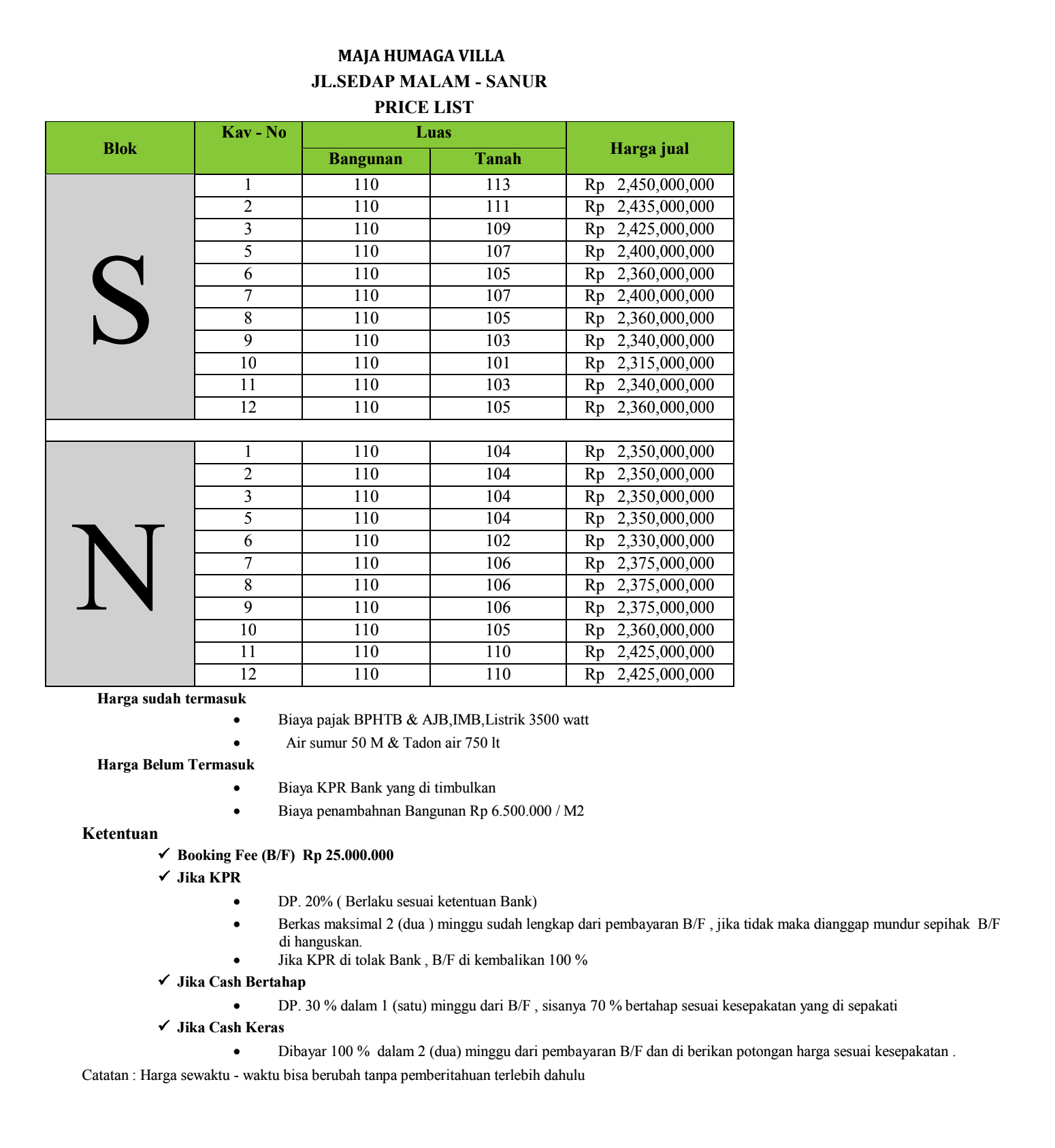 Pajak BPHTB, Biaya Balik Nama, Sertifikat SHM Hak Milik , IMB / PBG / SLF, listrik 2.200 watt , Air Sumut Bor